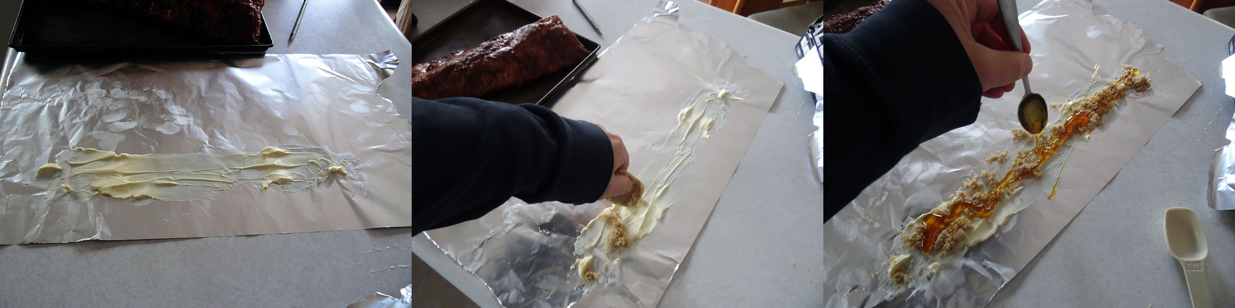 I took a piece of foil large enough to wrap the rack. I put 15 ml (1 tbsp) soft butter on a strip on half the foil. I sprinkled 15 ml (1 tbsp) of brown sugar over the butter and spooned 15 ml (1 tbsp) of honey over that.