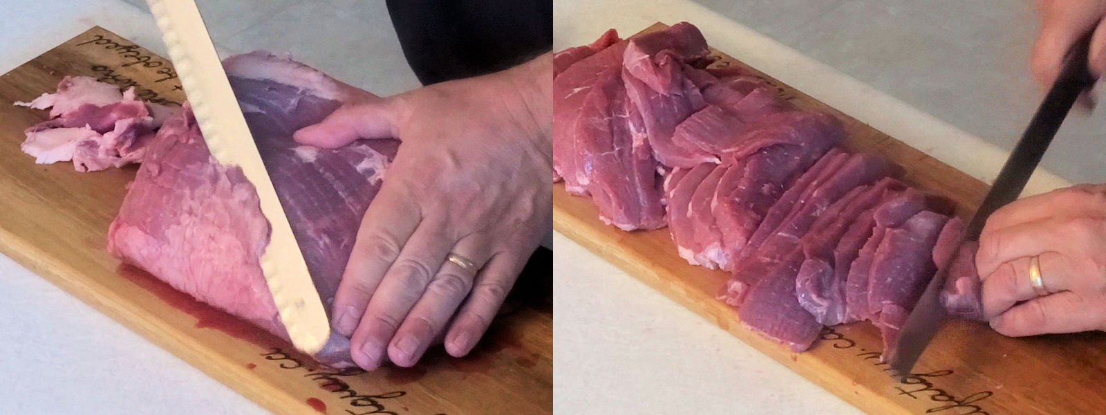 - Cut the meat into 1/4 inch thick strips (it is easier if you put the roast in the freezer for 1 1/2 to 2 hours first)