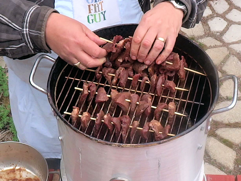 - Put the meat on bamboo skewers and let hang at room temperature for 1 hour.