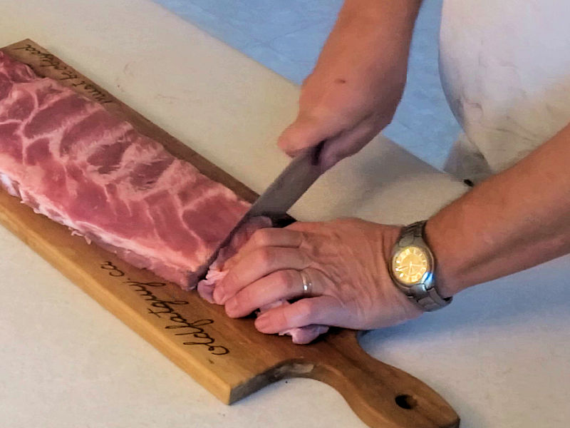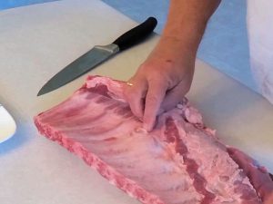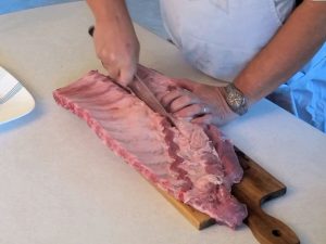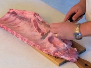 Start by going to the bone side of the ribs. There is a skirt of meat that runs at an angle across one end of the ribs. Trim this off.