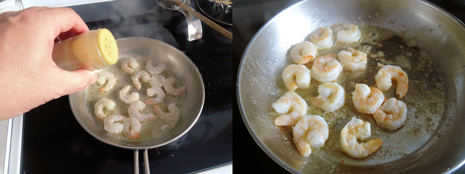 I started by melting 15 ml (1 tablespoon) of butter in a saute pan over medium high heat until it is foaming heavily. I put 12 reasonably large shrimp in the pan and sprinkled it with 3 ml (1/2 teaspoon) of garlic powder and 3 ml (1/2 teaspoon) of onion powder. Cook it for 1 to 2 minutes until just starting to firm on the one side. Flip and cook for 1 to 2 minutes until just pink. Remove from heat and let cool.