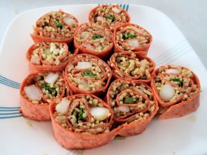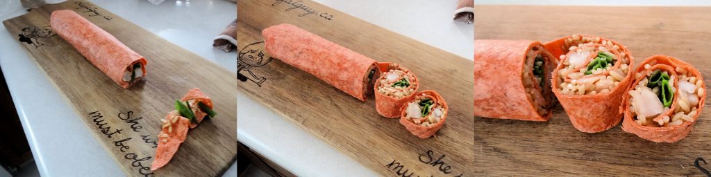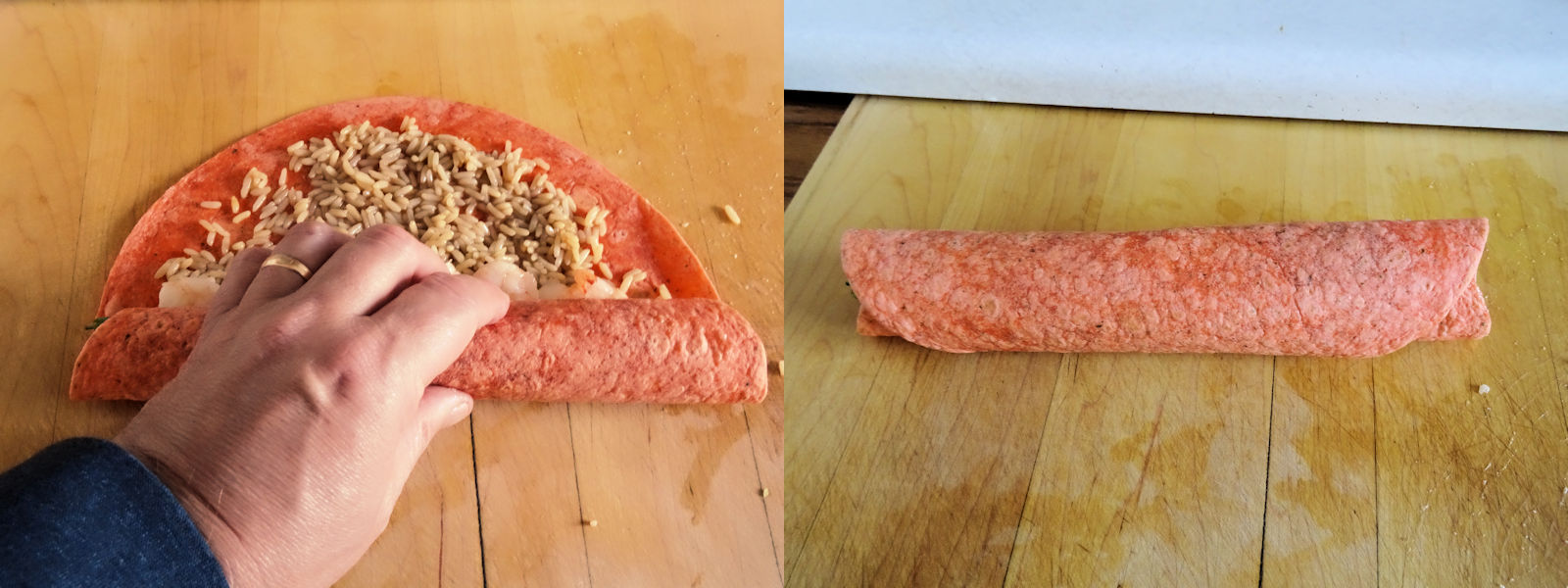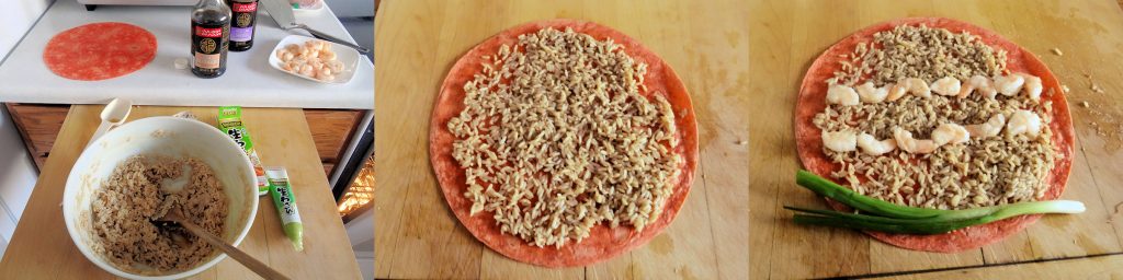 Spread half the rice mixture on a 10 inch tortilla. Put a green onion across the bottom. Cut 6 of the shrimp in half so they will lie straighter. Put the shrimp in two lines about an inch apart either side of the middle of the tortilla.