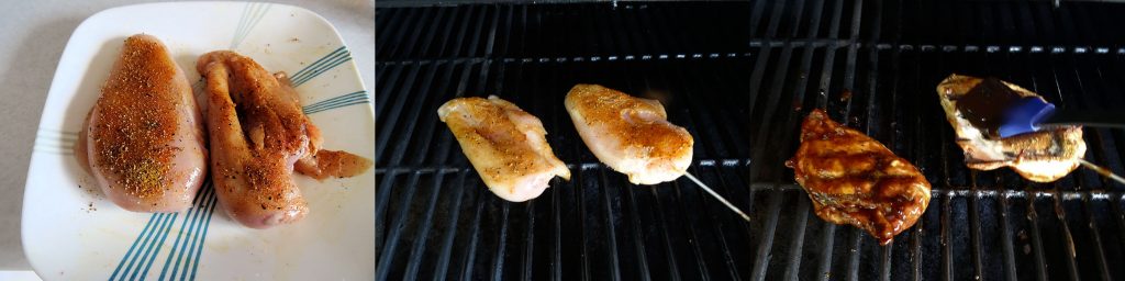 I rubbed the spice mixture onto two boneless skinless breasts and let them sit while I preheated my smoker to 250 F. You could also cook this in a 250 F oven or over indirect heat in a barbecue. However, I find smoking tends to keep the chicken moist.